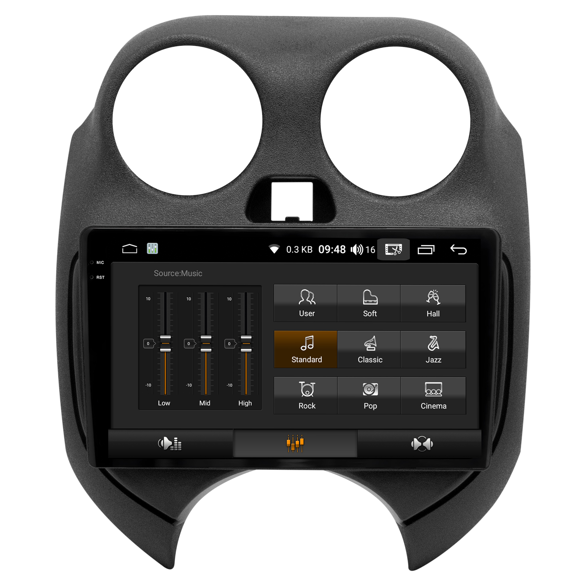- Equalização Bass/Middle/Treble e faixas de equalização predefinidas com Classic jazz, pop, Speech e Rock.