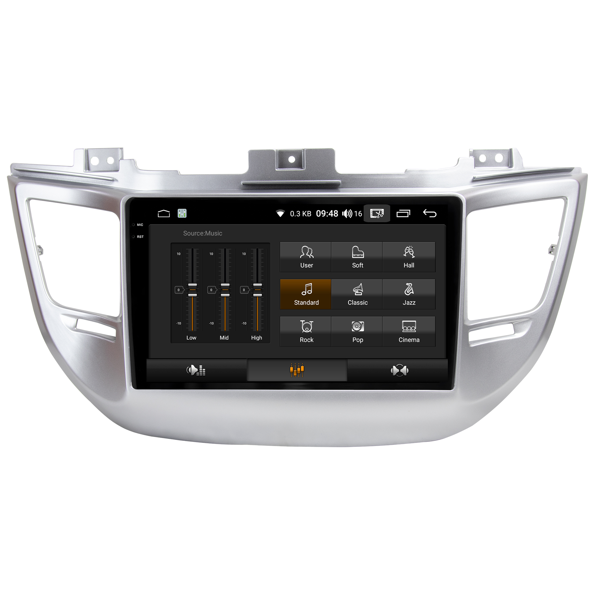 - Equalização Bass/Middle/Treble e faixas de equalização predefinidas com Classic jazz, pop, Speech e Rock.