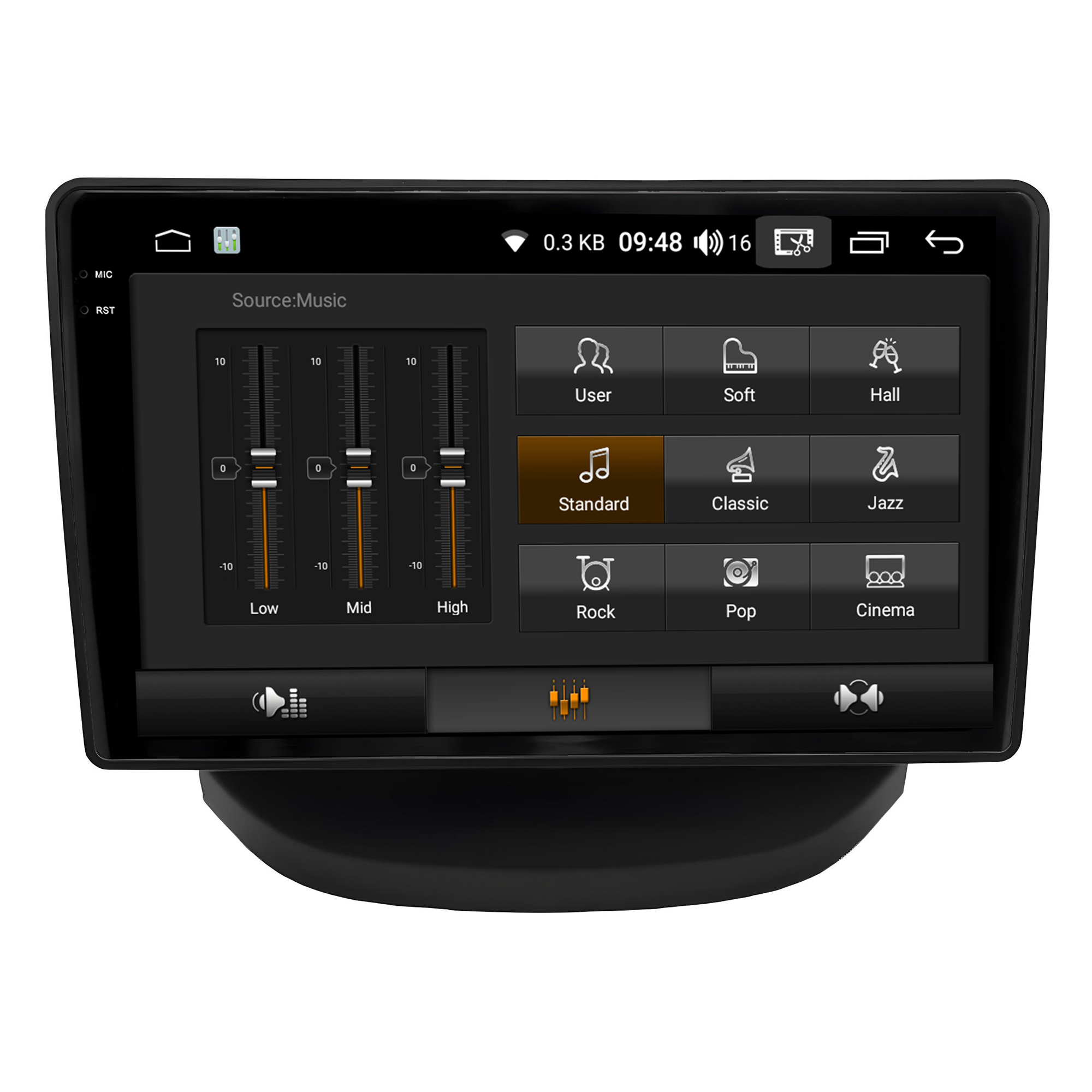 - Equalização Bass/Middle/Treble e faixas de equalização predefinidas com Classic jazz, pop, Speech e Rock.