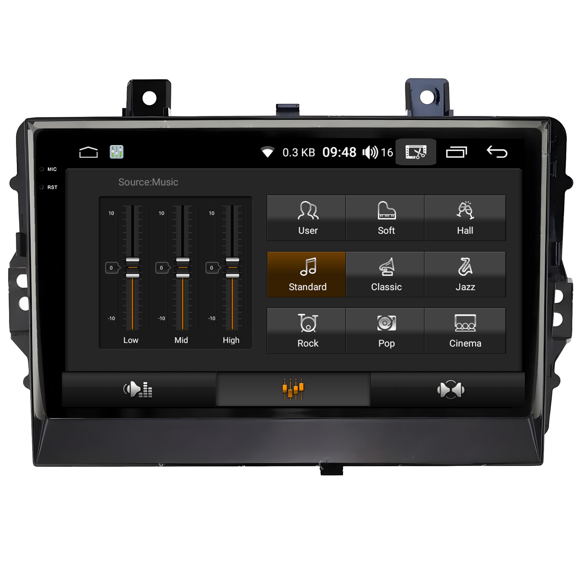 • Equalização Bass/Middle/Treble e faixas de equalização predefinidas com Classic jazz, pop, Speech e Rock.