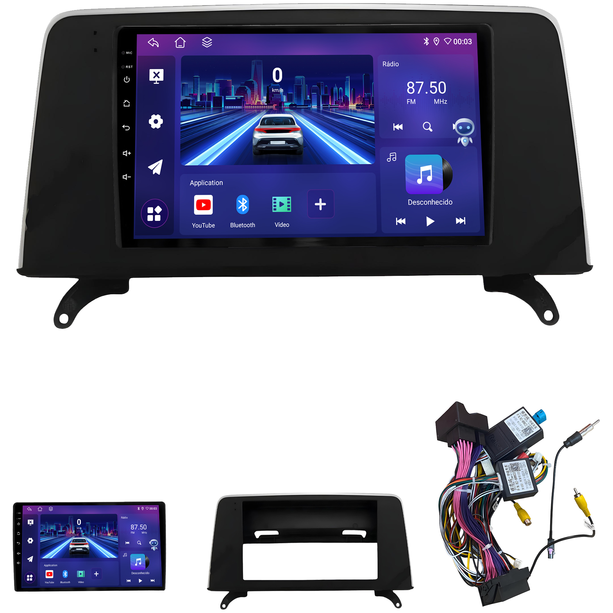 - Bluetooth: Permite realizar e receber ligações. Possui agenda telefônica com pesquisa de nomes, histórico de chamadas, funções auto-conectar.